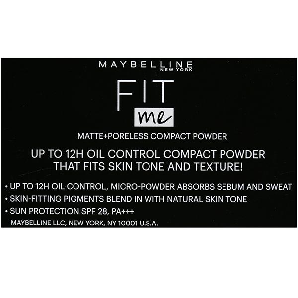 Product Information – Maybelline New York Fit Me compact has UV filters that protect skin from both sun darkening and damage. Helps you stay 12 Hr Fair and Fresh. Contains Perlite, a pure mineral that helps absorbs oil and sweat. Gives a naturally perfect-looking complexion. Contains SPF 28 to protect your skin. Suitable for everyday use. Perlite, a pure mineral that visibly lightens complexion, while absorbing sweat and oil UV filters protects from sun darkening and damage Keeps your complexion looking fresh for 12 hours and feels perfect all day long even in hot, humid weather. Superior puff and packaging.
