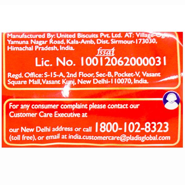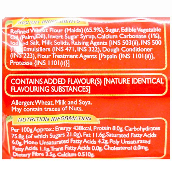 Refined wheat flour (Maida) (65.9%), Sugar, Edible vegetable oil (Palm Oil), Invert sugar syrup, Calcium Carbonate (1%), Iodized Salt, Milk solids, raising agents [INS 503 (ii), INS 500 (ii), Emulsifiers (INS 471, INS 322), Dough conditioner (INS 223), Flour treatment agents [Papain {INS 1101 (ii)}, Protease {INS 1101 (i)}]