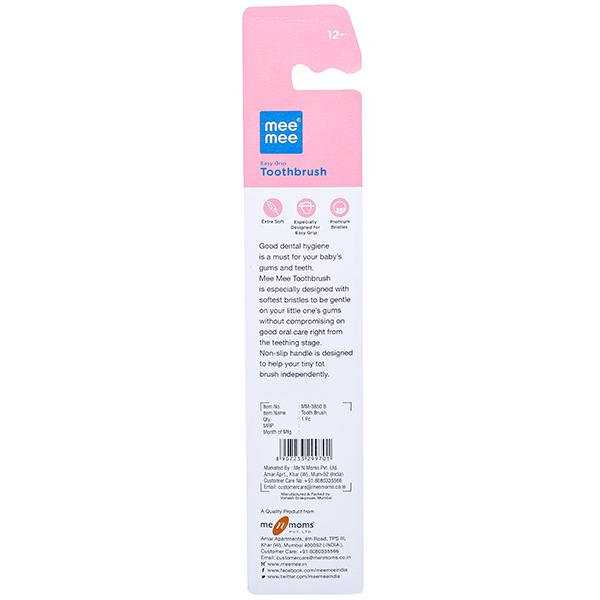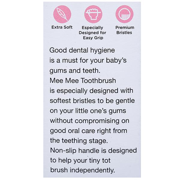 Product Information - Good dental hygiene is a must for your baby’s gums and teeth. Mee Mee Toothbrush is especially designed to be gentle on your little one’s gums without compromising on good oral care right from the teething stage. Soft bristles from DuPont, keep your baby's gums free of food particles, bacteria and plaque. Erogonomic design with narrow brush head for your tiny tot's little mouth.