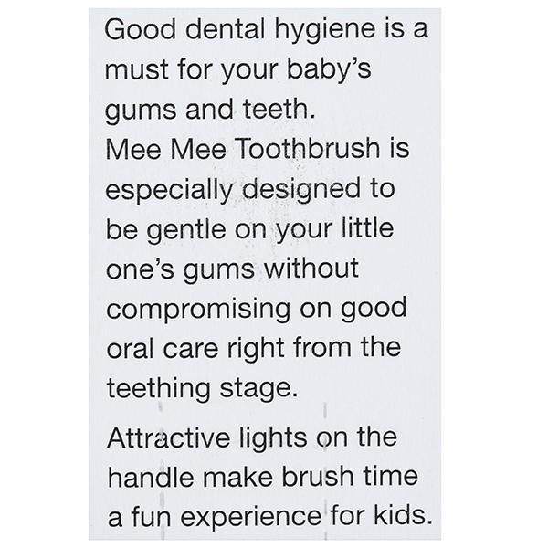 Product Information - Good dental hygiene is a must for your baby’s gums and teeth. Mee Mee Toothbrush is especially designed to be gentle on your little one’s gums without compromising on good oral care right from the teething stage. Soft bristles from DuPont, keep your baby's gums free of food particles, bacteria and plaque. Erogonomic design with narrow brush head for your tiny tot's little mouth.