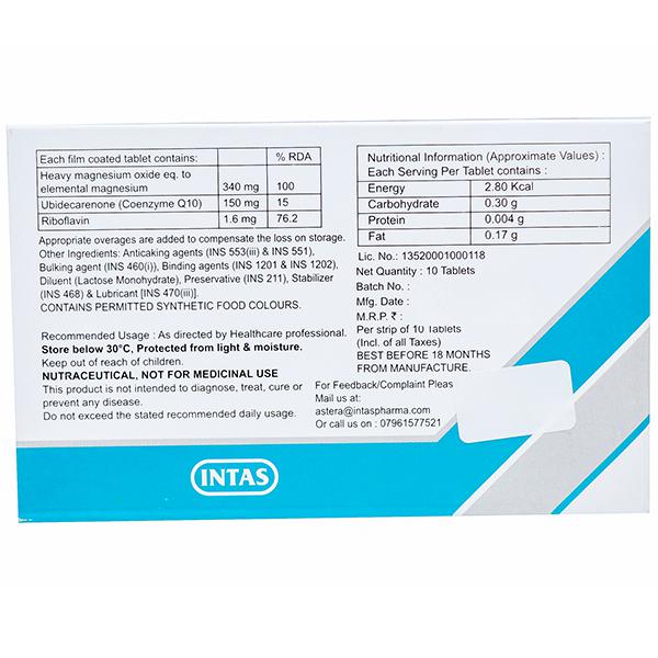 Heavy Magnesium Oxide eq. to Elemental Magnesium: 340 mg, Ubidecarenone (Coenzyme Q 10): 150 mg, Riboflavin: 1.6 mg