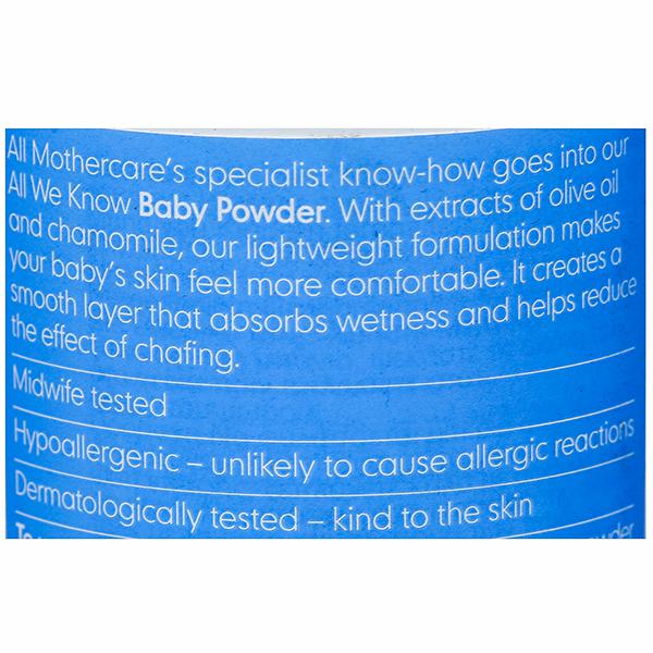 Mothercare All We Know Baby Powder has been specifically designed, adhering to strict exacting standards, to ensure that the soft skin of the baby gets the tender care it deserves while at the same time allowing your little angel to breathe naturally. It creates a smooth layer that absorbs wetness and helps reduce the effect of chafing.