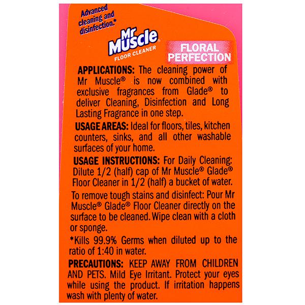 Product Information- Mr Muscle floor cleaner with Glade combines the cleaning power of Mr Muscle and the exclusive fragrance of Glade Floral. Experience hygienic, shiny, sparkling clean floor with an aromatic freshness of Floral with Mr Muscle Floor Cleaner - Floral. It's a new age all-purpose hard floor cleaner that eliminates odour and leaves a refreshing Floral scent behind. It deep cleans and quickly removes stubborn everyday dirt and grime from all kinds of hard floor surfaces.