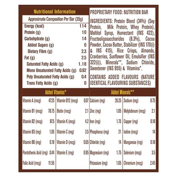 Ingredients- Protein Blend, Soy Protein, Milk Protein, Whey Protein, Maltitol Syrup, Humectant, Fructooligossaccharides, Cocoa powder,Cocoa Butter, Almonds, Cranberries, Rice Crisps, Sunflower Oil, Stabilisers, Emulsifiers, minerals, sodium chloride, sweetener, vitamins.