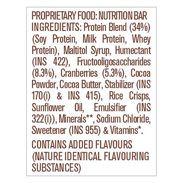 Protein Blend, Soy Protein, Milk Protein, Whey Protein, Maltitol Syrup, Humectant, Fructooligossaccharides, Cranberries, Cocoa powder, Rice Crisps, Sunflower Oil, Stabilisers, Emulsifiers, minerals, sodium chloride, sweetener, vitamins