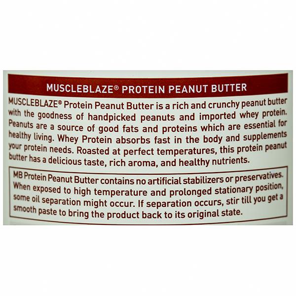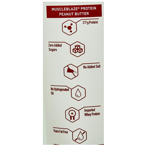 Product Information – MuscleBlaze Protein Peanut Butter is crafted for the fitness enthusiasts who seek a blend of quality protein and fat in their diet. Peanut Butter is a source of essential fatty acids which our body needs to function in a proper manner. Peanuts are a rich source of protein but in MuscleBlaze Peanut Butter, you get the power of protein from a blend of peanut and whey protein to elevate your muscle gains and meet your recommended daily allowance of essential fatty acids. Roasted at the perfect temperature, MuscleBlaze Natural Peanut Butter contains peanuts free from any GMOs. This peanut butter is free from any added salts or sugars to deliver only the best and the natural.