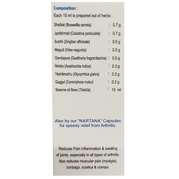Product Information – Nartana massage oil is an ayurvedic proprietary Medicine.it gives relief from Bones and joints pain. Reduces pain inflammation and swelling of joints, especially in all types of arthritis. Also reduces muscular pain (myalgia),lumbago, sciatica and cramps.