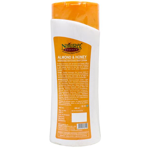 Product Information- Who wouldn't love their skin to feel smooth and soft? With Nature's Essence Almond & Honey Body Lotion, get the goodness of almond oil and natural honey. This lotion intensely hydrates and nourishes dry and flaky skin. It leaves your skin feeling irresistibly smooth and supple all day long. With regular use, it can help lighten your skin tone, making it look naturally glowing. Revive beautiful skin with Nature's Essence. This lightweight non-sticky moisturizer offers the deep nourishing effect that protects and restores dry skin.