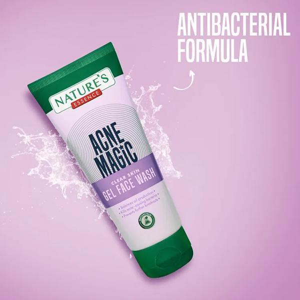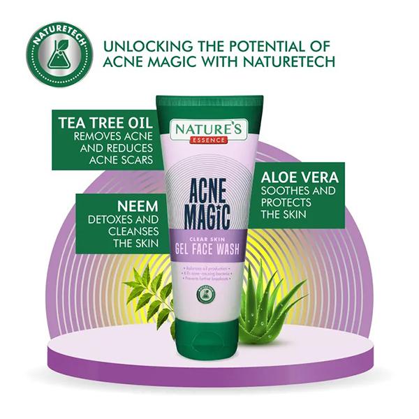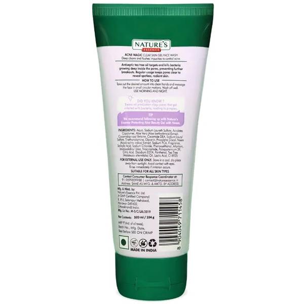 Product information- Nature's Essence Acne Magic Clear Skin Gel Face Wash deep cleans and flushes impurities to control acne. Antiseptic tea tree oil targets and kills bacteria growing deep inside the pores, preventing further breakouts. Regular usage keeps pores clear to reveal spotless, radiant skin.