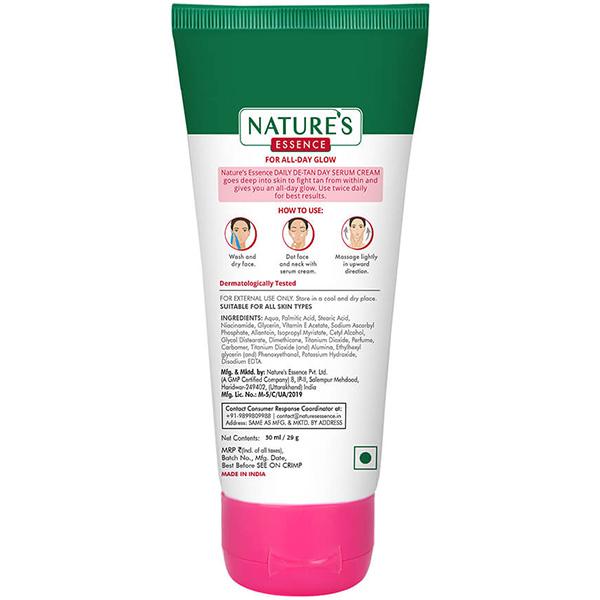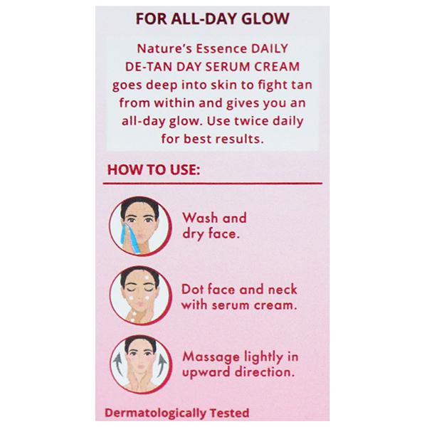 Nature's Essence Daily De-tan day serum cream goes deep into the skin to fight tan from within and gives you an all day glow. Use twice daily for best results