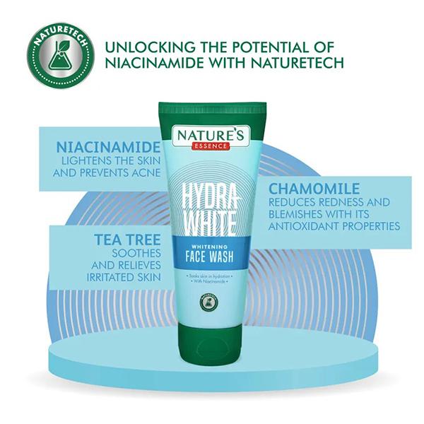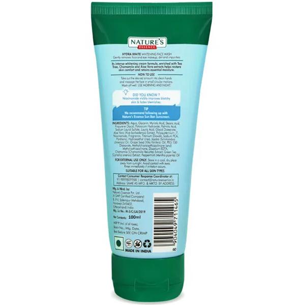 Nature's Essence Hydra White Brightening Face Wash gently removes face and eye makeup, dirt and impurities. Its intense cream formula, enriched with tea tree, chamomile and aloe vera extracts helps restore skin comfort and retains essential moisture.