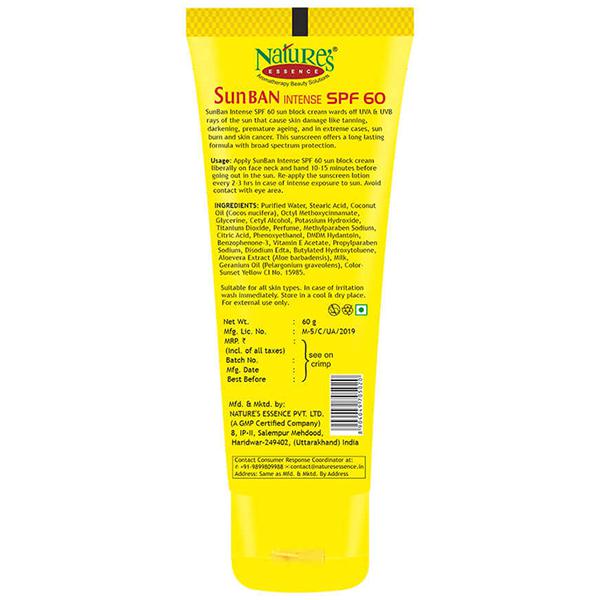 Nature's Essence Sun Ban SPF 60 wards off UVA and UVB rays of the sun that cause skin damage like tanning, darkening, premature aging, and sunburns. This sunscreen offers a long-lasting formula with broad-spectrum protection.