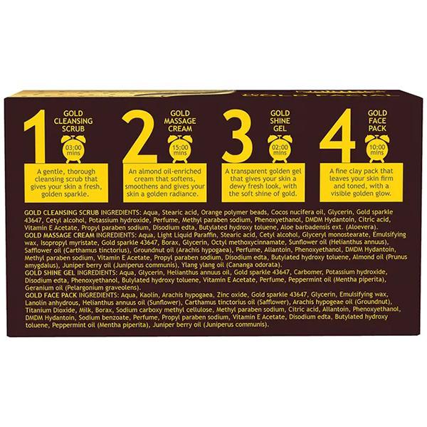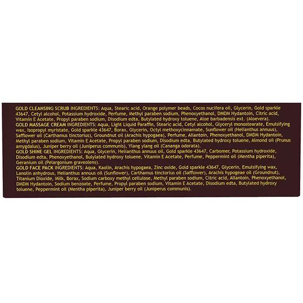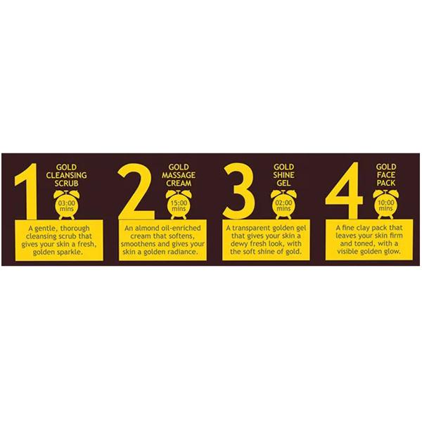 - 4 steps to a great at-home facial; gold cleansing scrub, gold massage cream, gold shine gel and gold pack