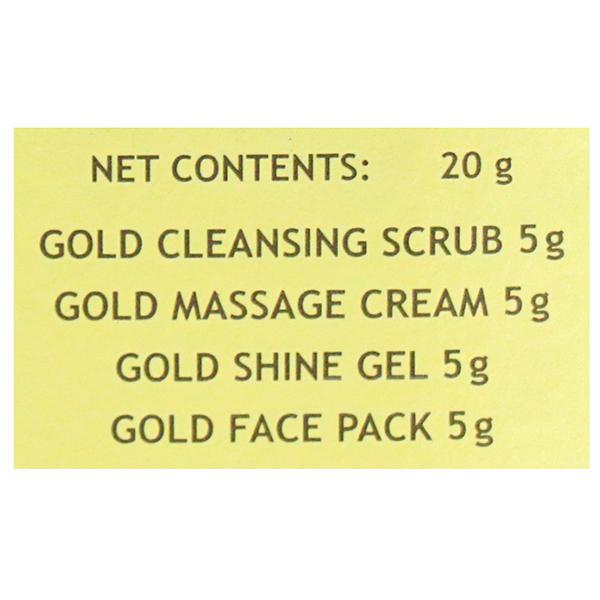 - Gold Massage Cream (5g): This cream is specially developed to give a better and lasting glowing look on the skin with gold dust. The added nourishing oils offer deep skin conditioning and softness to the skin. Gentle massage with this cream imparts a youthful effect, even texture to dry, dehydrated, or rough skin type.