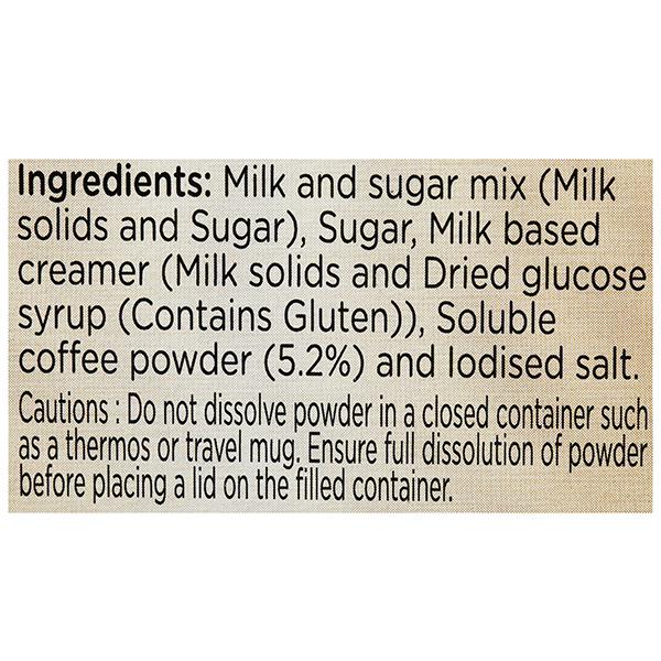 Ingredients:- Sugar,Instant Coffee,Glucose Syrup,Skim Milk Powder, Coconut Oil,Lactose.Salt,Milk Fat.