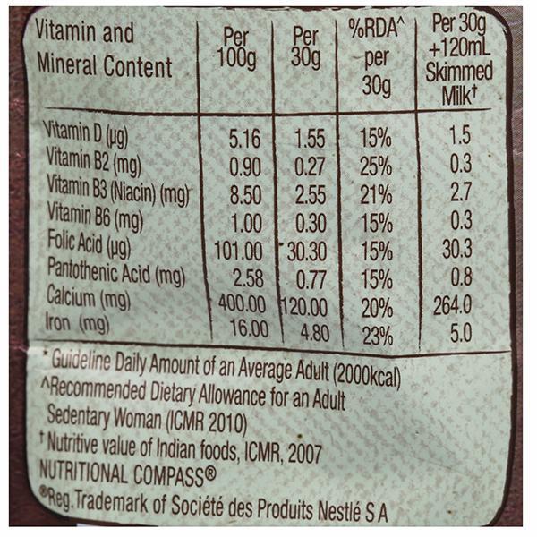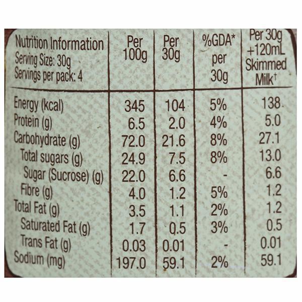 Relish the goodness of Nestle Koko Krunch which provides more than just a good start to your day, by offering a sensible, great-tasting breakfast focused towards a better, healthier future. Whole grain is an important part of a healthy balanced diet and Nestlé ensures you and your kid gets the whole grain goodness paired with a lot of deliciousness. What's more? Koko Krunch is your everyday reliable source of Vitamin D and Calcium as well as B-vitamins, Iron and Fibre. These nutrients, with a chocolatey taste, combine to give a nourishing start to your day. Koko Krunch Cereals can be prepared easily by adding 26 grams of Nestlé Koko Krunch with 120 ml of warm or cold milk for an instant breakfast. The cereal remains crunchy even in warm milk. Allergens: It may contain Milk, Peanuts, Tree Nuts, Mustard, Celery, Sesame and Lupin. Storage Instruction: Store in a cool, dry and hygienic place. After opening, transfer contents to an airtight container. Use within 3 weeks
