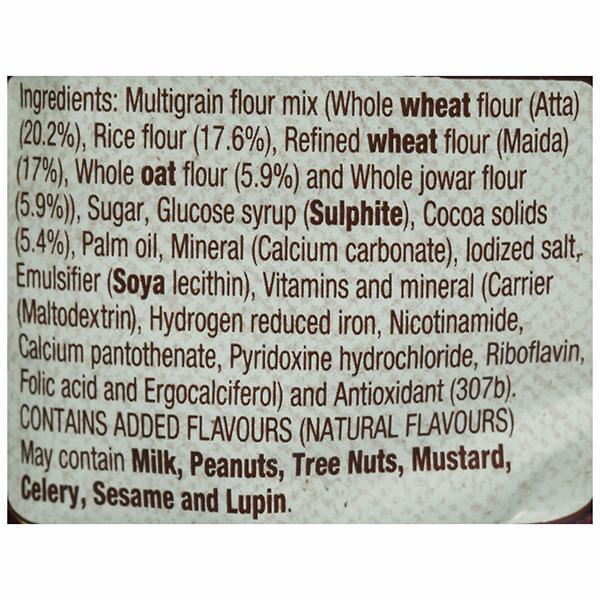Multigrain flour mix (Whole wheat flour (Alta) (20.2%), Rice flour (17.6%), Refined wheat flour (Maida) (17%), Whole oat flour (5.9%) and Whole jowar flour (5.9%)), Sugar, Glucose syrup (Sulphite), Cocoa solids (5.4%), Palm oil, Mineral (Calcium carbonate), Iodized salt, Emulsifier (Soya lecithin), Vitamins and mineral (Carrier (Maltodextrin), Hydrogen reduced iron, Nicotinamide, Calcium pantothenate, Pyridoxine hydrochloride, Riboflavin, Folic acid and Ergocalciferol) and Antioxidant (307b). CONTAINS ADDED FLAVOURS (NATURAL FLAVOURS) May contain Milk, Peanuts, Tree Nuts, Mustard, Celery, Sesame and Lupin.