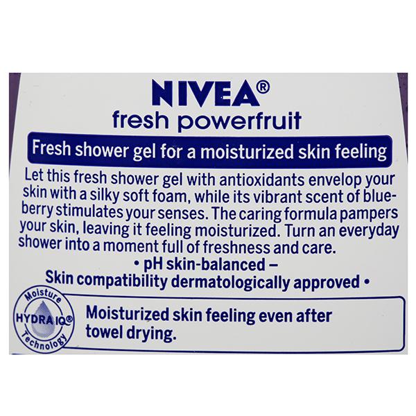 Nivea Power Fruit contains anti-oxidants with blueberry extracts that help nourish your skin. This shower gel has a pleasant fruity fragrance of the Acai berry that helps soothe your senses. The fine mixture of power fruit and blueberry gently cleanses your skin feeling pampered and revived. Stimulate your senses with the vibrant Acai berry fragrance, vitamin C and cranberry turns into caring soft foam - for the fabulous sensation of beautiful, silky skin. Feel reborn with every shower. It is pH skin-balanced and its skin compatibility is dermatologically approved. The Hydra IQ Moisture Technology ensures moisturised skin feeling even after towel drying. Hydra IQ is based on a glyceryl-glucose compound, proven in-vitro to activate the formation in skin of new aquaporins, proteins which allow water molecules to travel in and out of skin cells. The tissues´ ability to retain water is thus improved resulting in a better, long-lasting moisturisation of cells.