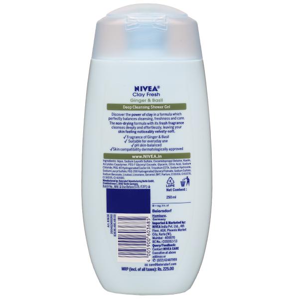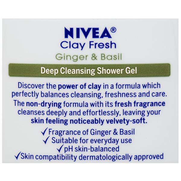 Nivea Clay Fresh Ginger & Basil Shower Gel is discover the power of clay in a formula which perfectly balances cleansing, freshness & care. The non-drying formula with its fresh fragrance cleanses deeply & effortlessly, leaving your skin feeling noticeably velvety-soft.