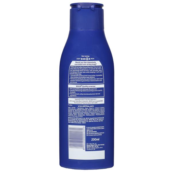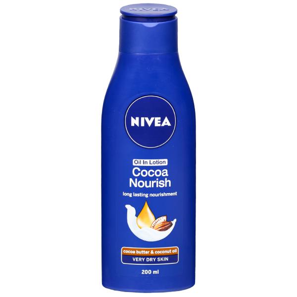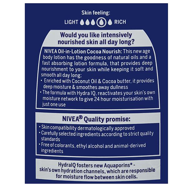 Product Description - Would you like intensively nourished skin all day long, Nivea Oil-in-Lotion Cocoa Nourish-The new age body lotion has the goodness of natural oils, and a fast absorbing lotion formula, that provides deep nourishment to your skin while keeping it soft and smooth all day long, enriched with Coconut oil and Cocoa butter, it provides deep moisture & smoothes away dullness, the formula with Hydra IQ, reactivates your skin`s own moisture network to give 24 hour moisturisation with just one use.
