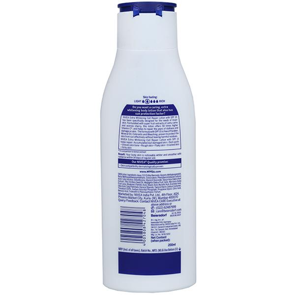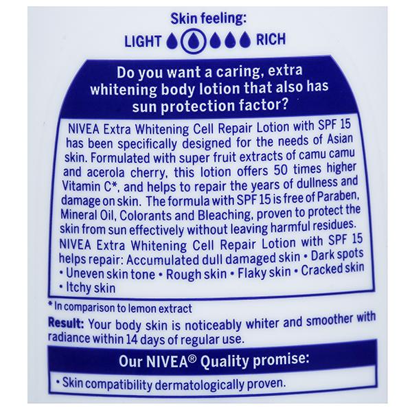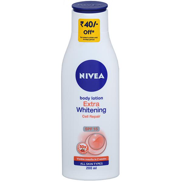 Nivea Extra Whitening Cell Repair Body Lotion SPF 15 helps to reverse the effects of sun damage. Its vitamin C extracts and SPF 15 along with its cell repair formula gives one noticeably even-toned skin within 14 days of regular usage. It is suitable for all skin types.