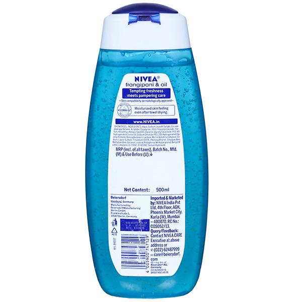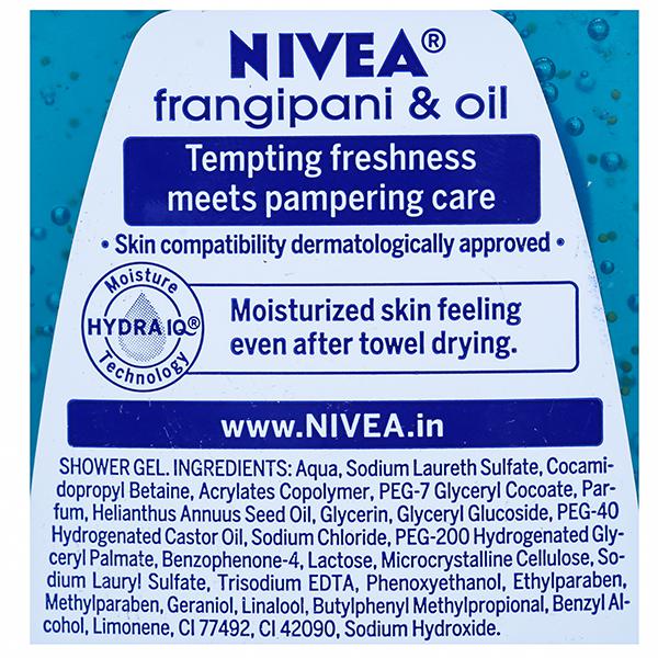 Product Information –  NIVEA Frangipani and Oil Shower Gel provides tempting freshness and pampering care for your skin under the shower. Let this fresh shower gel with care oil pearls envelop your skin with a silky soft foam, while its invigorating scent of frangipani stimulates your senses. The caring formula pampers your skin, leaving it feeling moisturized. Discover the unique combination of freshness and rich care. Relax and rejuvenate with every shower. With Hydra IQ moisture technology for a moisturized skin feeling even after towel drying. Skin tolerance dermatologically proven. Leaves your body feeling cleansed, moisturized and cared for. Provides long lasting freshness to the skin. Moisturized skin even after towel drying. Skin compatibility dermatologically approved.