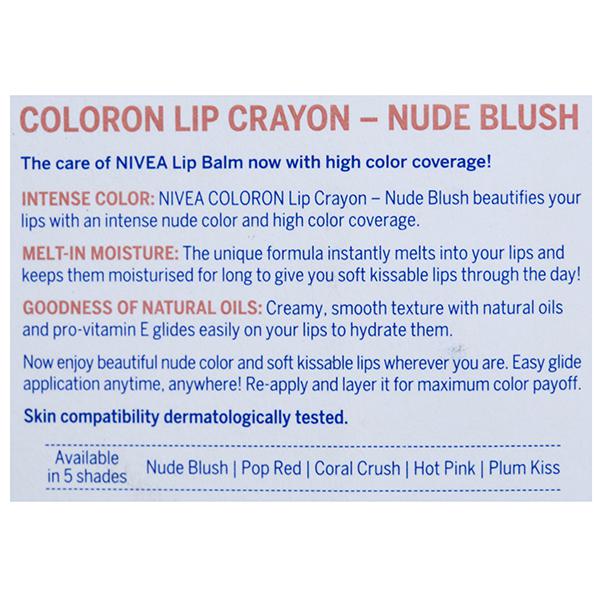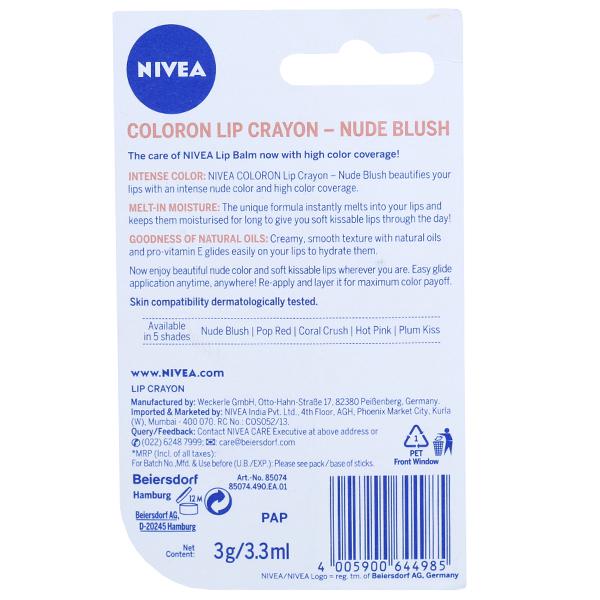 The care of Nivea lip balm now with high colour coverage! Intense colour - Nivea coloron lip crayon – nude blush delights your lips with a rosy nude colour and high colour coverage. Melt-in moisture - this unique moisturizing formula instantly melts into your lips and provides long lasting moisturizing to give you soft kissable lips all day! Goodness of natural oils - creamy formula with natural oils and pro-vitamin e gives you a pleasant application. Now enjoy nude blush of colour and soft kissable lips wherever you are. Easy glide application anytime, anywhere! Re-apply and layer it for maximum colour payoff.