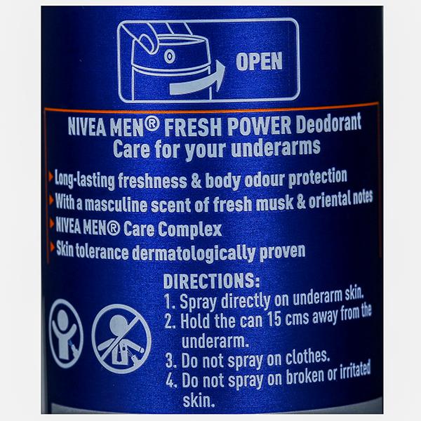 Product Information - Nivea men fresh boost deodorant, for men who want to feel fresh all day with a boost of powerful masculine fragrance.Managing a job, maintaining a home, and having a social life means that there are never enough hours in the day. A fresh start is a must!nivea men fresh power boost deodorant is for men who are always on the run. A men’s deodorant that gives you a powerful boost of freshness and day long protection from body odour. This body spray for men comes with a warm musk and citrus fragrance notes, which keep you in high gears, throughout the day.Enriched with an optimal combination of reliable deodorant protection and Nivea men care complex, this deo for men keeps you refreshed while caring for your skin, unlike other deodorants for men. It has been tested and dermatologically proven to be skin tolerance.Be it an office presentation or attending a social event, take the day head on, with the confidence of day long freshness and body odour protection. It starts with you!.