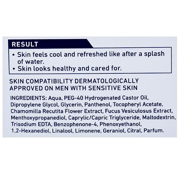 The extra gentle and alcohol-free formula of Nivea Men Sensitive After Shave Lotion contains soothing and healing ingredients like Chamomile, Vitamin E and Provitamin B5 that help care for sensitive, just shaved skin. It is quickly absorbed into the skin and leaves it feeling soothed and moisturised. Its skin compatibility is dermatologically approved. Regular usage results in redness-free and irritation-free skin that improves over time. The unique Nivea Men Sensitive range is specially designed for men with sensitive skin. Its formulation contains natural Chamomile and offers gentle protection and soothing care for easily irritated skin. The Sensitive Face Care Products with Active Comfort System not only soothe irritations instantly, but also improve skin’s own defence over time. Apply liberally on the shaved area and massage into skin. For best results, shave with the Nivea Men Sensitive Shaving Gel or Foam.