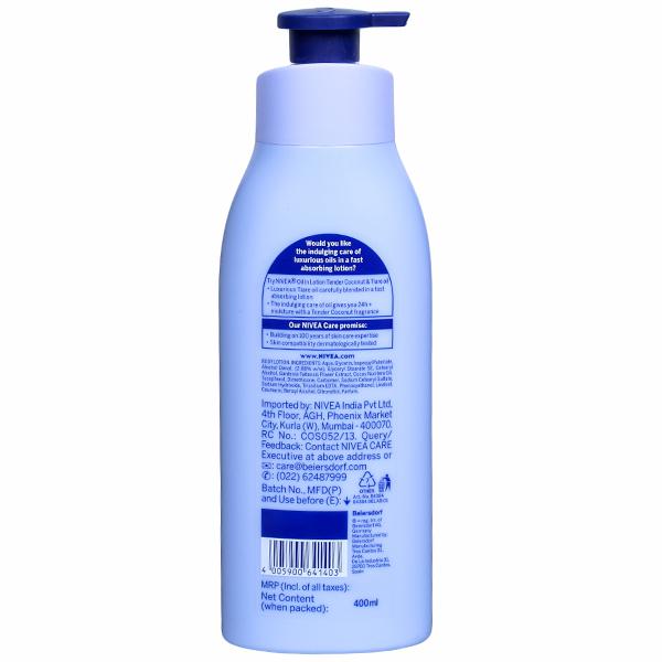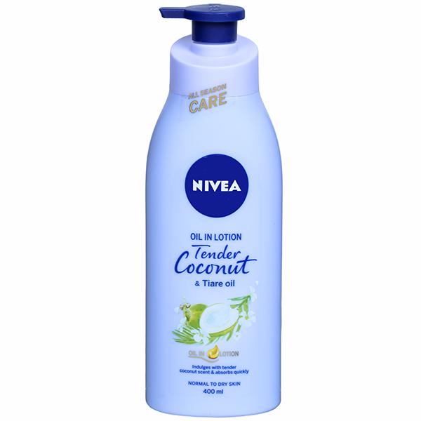 The new Nivea oil in lotion tender coconut & tiare oil in a carefully blended, fast absorbing lotion. The indulging care of oil gives you 24 hours moisture with a tender coconut fragrance.Directions For Use: