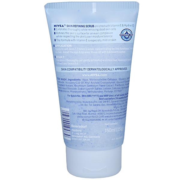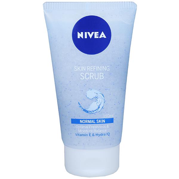 Nivea aqua effect skin refining scrub for normal skin is enriched with vitamin e and hydra iq. Its effective formula exfoliates thoroughly while removing dead skin cells, refines the skin’s surface for an even complexion while respecting the skin’s own moisture balance. It is mild on the skin with vitamin e and hydra iq.