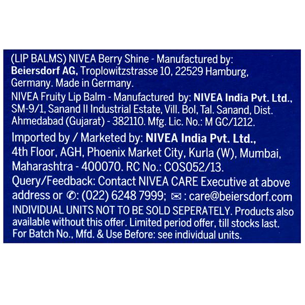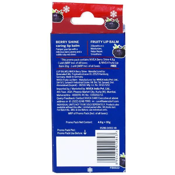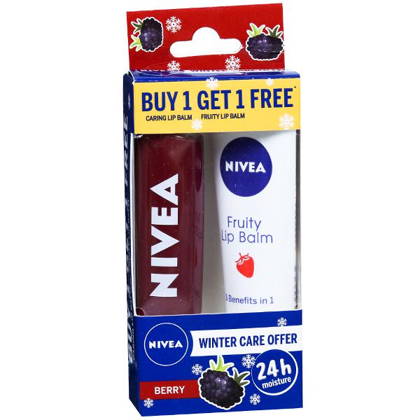 Product Information- Get sweater weather ready with NIVEA's amazing buy 1 get 1 winter care offer which includes Cherry Shine Lip Balm and Strawberry Lip Care Tube. Treat your lips to the nourishing care NIVEA lip balms with delightful fruity fragrances!