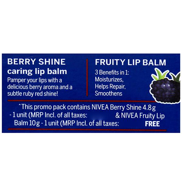 - NIVEA Fruity Cherry Shine Lip Balm (4.8g): NIVEA Fruity Cherry Shine Lip Balm keeps your lips smooth and moisturized over a touch of a deep red-toned glow and the kiss of a fruity-fresh cherry aroma. The formula with hydra IQ, fruit extracts and shimmering pigments provides long lasting care and intensive moisture to keep your lips soft, smooth and glossy.