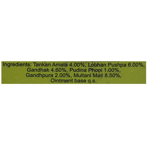 Tankan Amala: 4.00 %, Lobhan Pushpa: 6.00%, Gandhak: 4.60 %, Pudina Phool: 1.00%, Gandhpura: 2.00%, Multani Mati: 8.50%, Oinment Base q.s.
