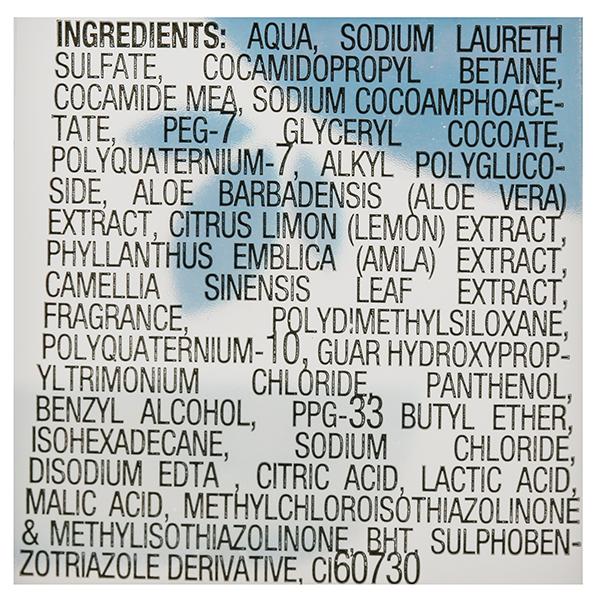 Gur Hydroxypropyltriammonium Chloride , Isohexadecane, D-panthenol, Methylchloroisothiazolinone, Polysilicon -17, Disodium EDTA, Poly Quatemium 7, Sodium Chloride, Sodium Laureth Sulfate, Poly Quaternium 10, Lemon & Amla, Sulphobenzotriazolederivative, Nymphaea Alba Oil, Orthophosphoric Acid ,