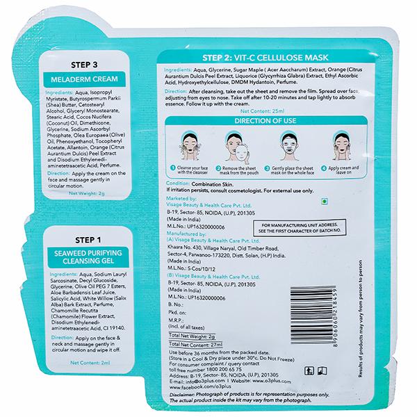 How to Use: Cleanse your skin with Acai Cleanser. Now apply the Vitamin C Cellulose Mask as directed on sachet. Follow up with the Meladerm Cream.