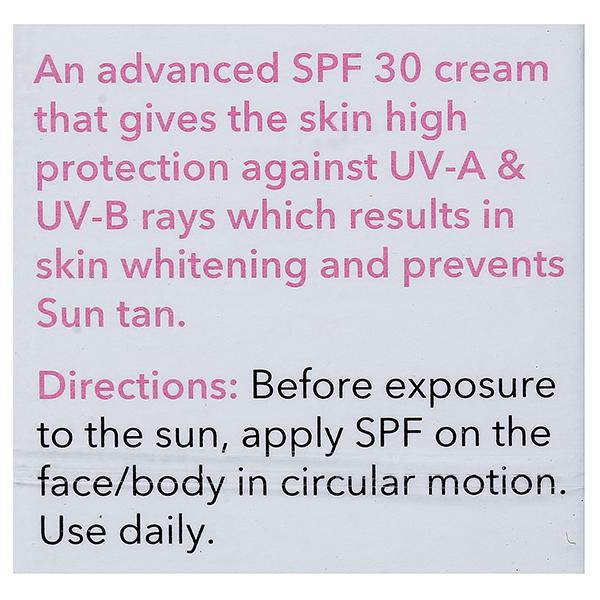 Enhance skin radiance to reveal a luminous skin with O3+ Whitening Cream SPF 30.The O3+ Whitening SPF 30 Cream gives complete protection from UVA, UVB rays while whitening the skin and preventing sun tan. It is suitable for brightening and whitening all types of skin as it offers increased sun protection of 8 Hours.