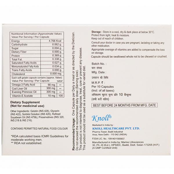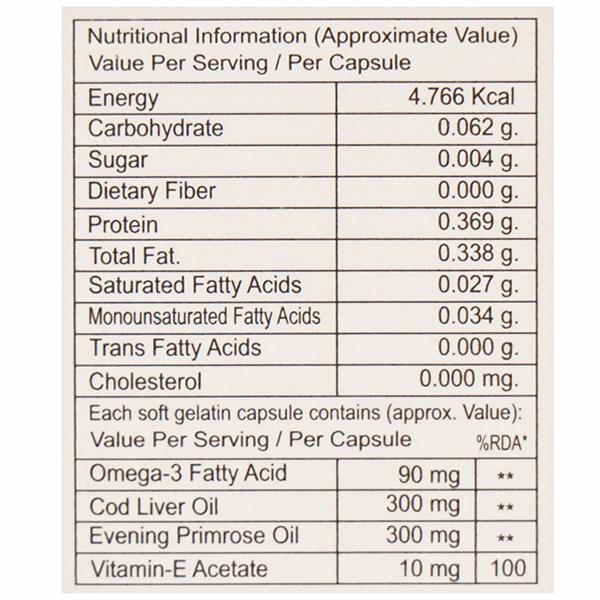 Omega-3 Fatty Acid: 90 mg, Cod Liver Oil: 300Mg, Evening Primrose Oil: 300Mg, Vitamin-E Acetate: 10Mg
