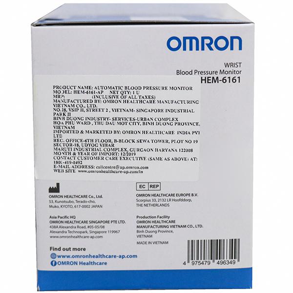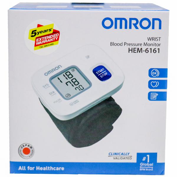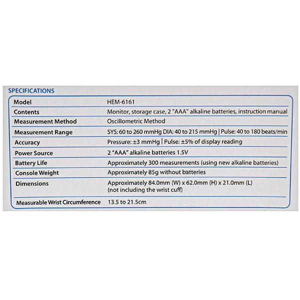 Omron Wrist Automatic Blood Pressure Monitor HEM 6161 is a fully automatic blood pressure monitor that uses the oscillometric method for quick & reliable measurement of blood pressure and pulse rate in adult population with wrist circumference ranging from 13.5 cm to 21.5 cm.