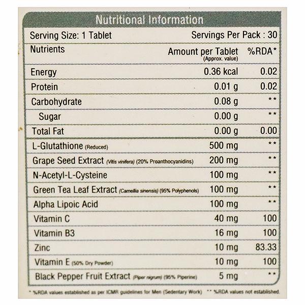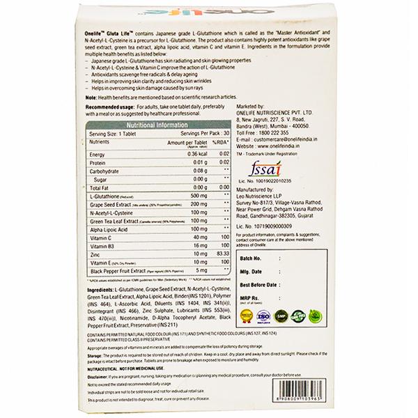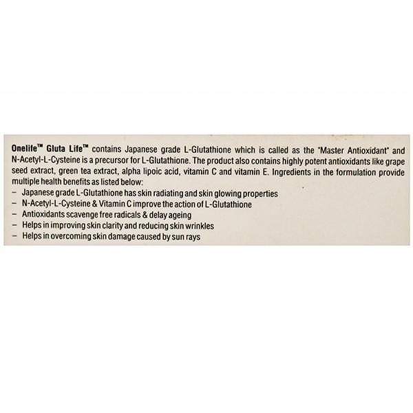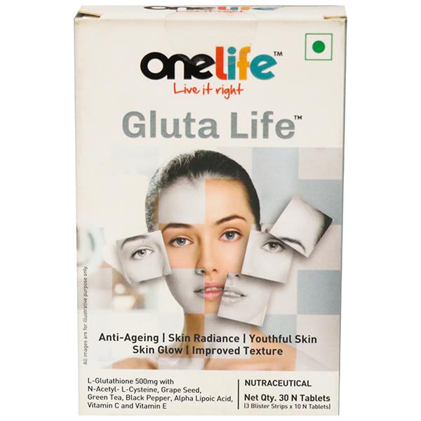 OneLife Glutalife is a combination of L- Glutathione, Alpha Lipoic Acid, Vitamin C, Vitamin E, Grape Seed extract and Lycopene which act as antioxidants and may play a major role in skin whitening. Glutathione may help to whiten the skin and improve the complexion. It also improves the quality and health of the skin. It plays a pivotal role in detoxifying cells, removing heavy metals, toxins and free radicals.