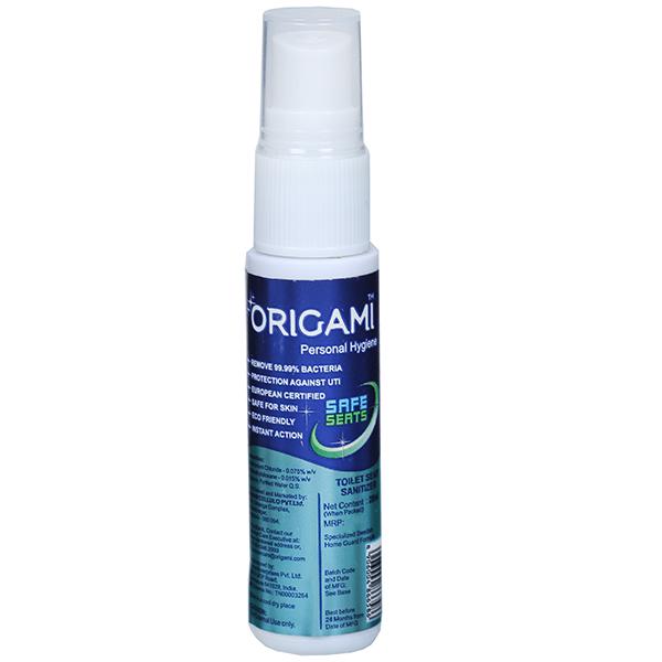 Product Information: Origami Safe Seats Toilet Seat Sanitizer is an instant toilet seat sanitizer spray which kills 99.99% germs, without leaving any residual. It consists of IPA Formulation which starts action within 10 seconds of application. The small and compact bottle makes it travel friendly, providing you protection from bathroom borne diseases like diarrhoea and urinary tract infection on the go and at home.