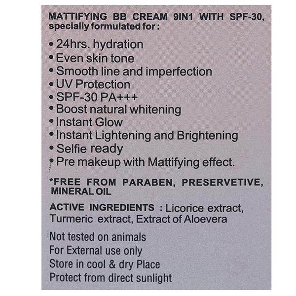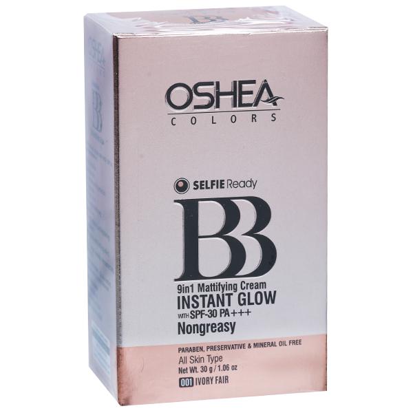 Oshea Colors BB Instant Glow Spf 30 pa+++ Nongreasy 9in1 Mattifying Cream gives you instant glow on your face. It Provides 24 hrs hydration, evens skin tone, hides lines and imperfections, boosts natural whitening ,instant lightening and brightening, making you selfie-ready. Suitable for All Skin Types.