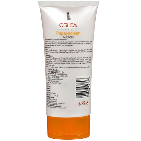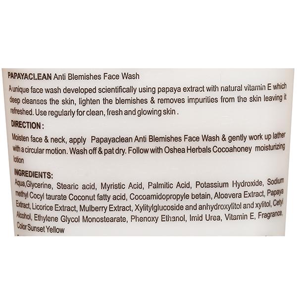 Oshea Herbals Papayaclean Anti Blemishes Face Wash is a unique face wash developed scientifically using papaya extract and natural vitamin E that deep cleanses the skin, lighten blemishes marks and removes impurities from the skin leaving it refreshed. Use regularly for a clean, fresh and glowing skin.