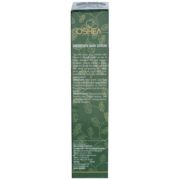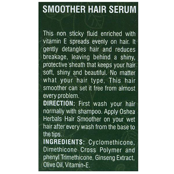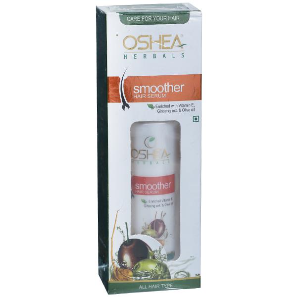 Smoother Hair Serum from Oshea is a perfect solution for almost every type of hair problem. Suitable for all hair types, this non sticky fluid gently detangles hair and reduces breakage. It spreads evenly on hair and leaves a shiny, protective sheath that keeps your hair attractive, soft and shiny. Features: Enriched with vitamin E Reduces breakage and keeps hair soft and shiny. Ingredients: Olive Oil, Vitamin E, Cyclopentassilloxane, Ginseng Extract, Dimethiconol, Dimethicone cross polymer and phenyl trimethicone.How to apply: Wash your hair normally with shampoo and apply this hair serum from the base to the tips on your wet hair.