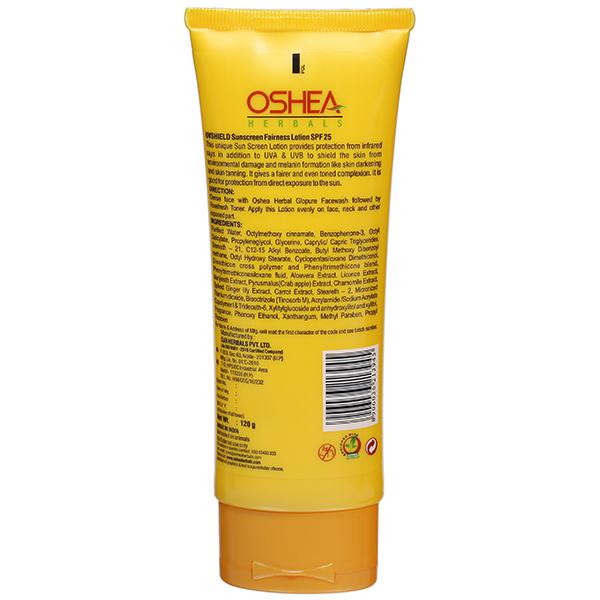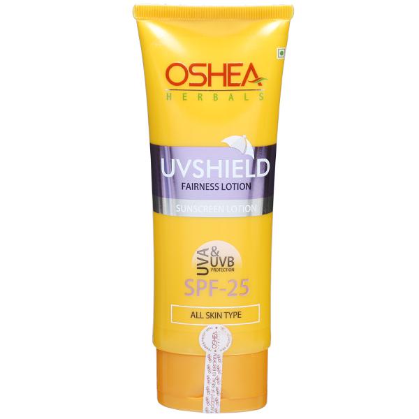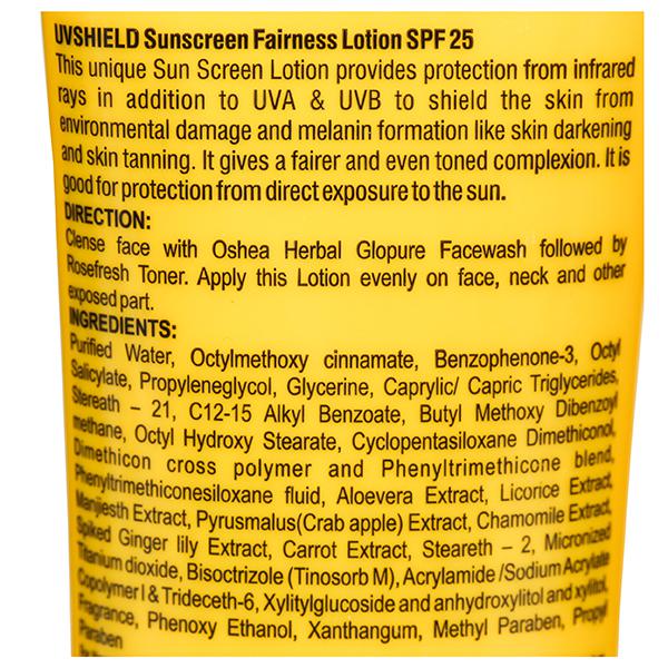 Oshea Herbals UV Shield Spf 25 Fairness Sunscreen Lotion provides protection from infrared rays in addition to UVA & UVB to shield the skin from environmental damage & melanin formation like skin darkening & skin tanning. It gives a fairer & even-toned complexion. It is good for protection from direct exposure to the sun.