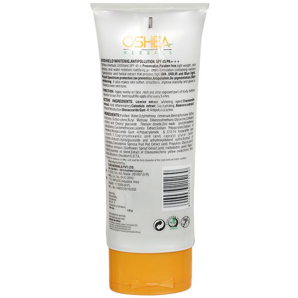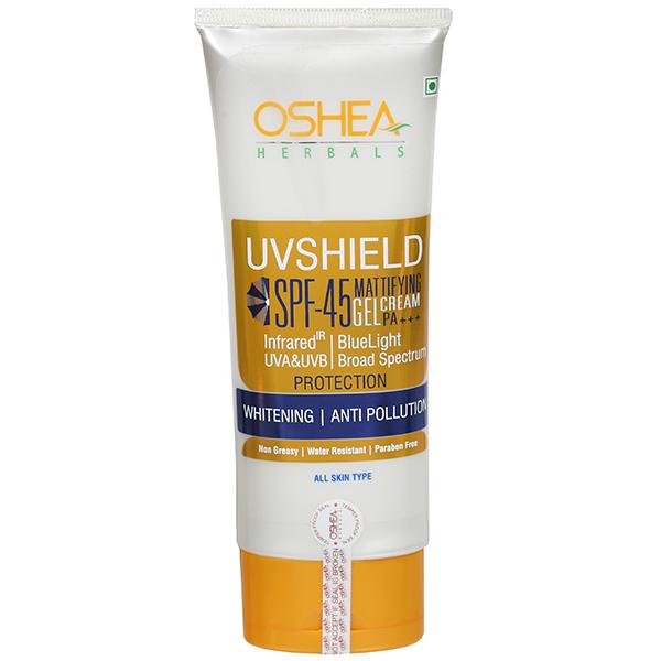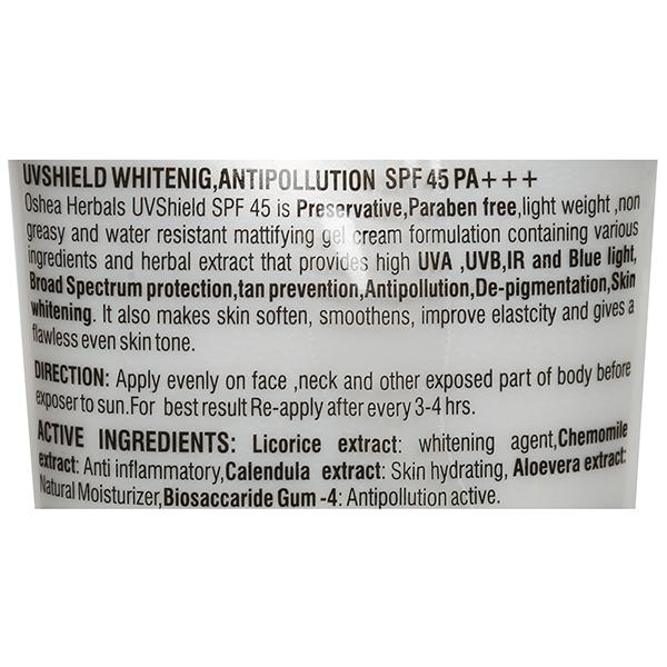 Oshea Herbals UV Shield Sun Block Cream is a preservative and paraben free, lightweight, non-greasy & water resistant mattifying gel cream formulation containing various ingredients & herbal extracts that provides UVA, UVB, IR & Blue light, Broad Spectrum sun protection. Also it helps in tan prevention, acts as an antipollution, de-pigmentation & skin whitening solution. Furthermore, it softens and smoothes skin, improves elasticity & gives you a flawless even toned skin.