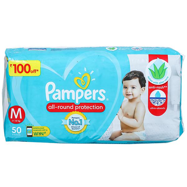 Pampers all-around protection pants style diapers are the only pants in India with Ultra Absorb Core, Double Leak Guards and Lotion with Aloe Vera. Ultra Absorb Core provides your baby with a new type of dryness overnight - breathable dryness. Magic gel locks wetness away to provide up to 12 hours of dryness. Now infused with a baby lotion that has Aloe Vera, helps protect your baby’s delicate skin from diaper rash and irritation. The new and improved product design enables a comfortable fit, closer to the baby’s body and a flexible waistband that adapts to the baby’s movements for a comfortable fit. A top layer with cotton-like soft material ensures a comfortable night’s sleep. Our pants with fun exterior graphics, fun designs and characters ensure you enjoy with your baby.