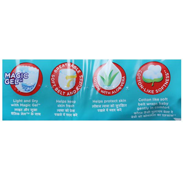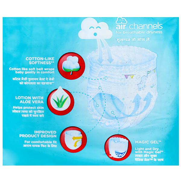 Pampers Baby Dry Pants with magic gel can absorb quicker and hence keep the skin dry . Pampers Pants style diapers have 3 revolutionary Extra Absorb Channels, that help distribute wetness evenly throughout the pants diapers, so wetness doesn’t collect in one place.