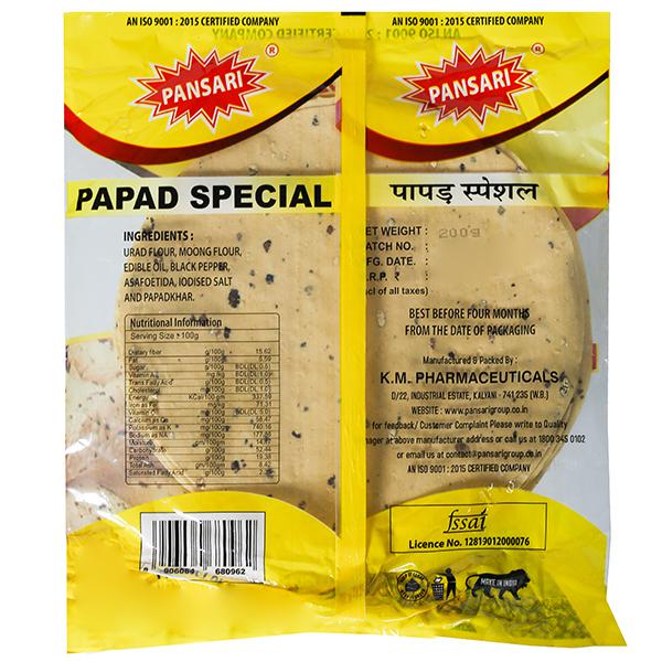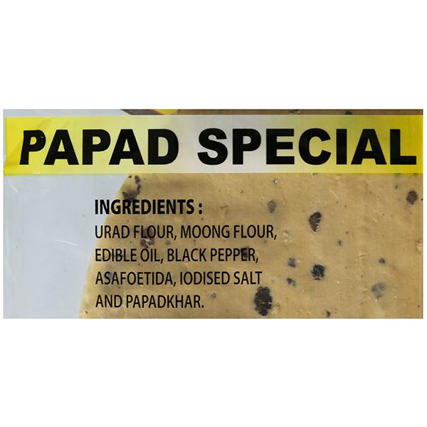 Ingredients - Urad flour, moong flour, edible oil, black pepper, asafoetida, iodised salt, papakhad