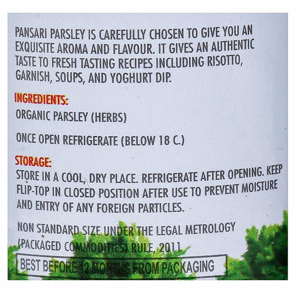 Product Information -Pansari Parsley is carefully chosen to give you an exquisite aroma and flavor. It gives an authentic taste to fresh tasting recipes, including soups, yoghurt dip, and rizotto.